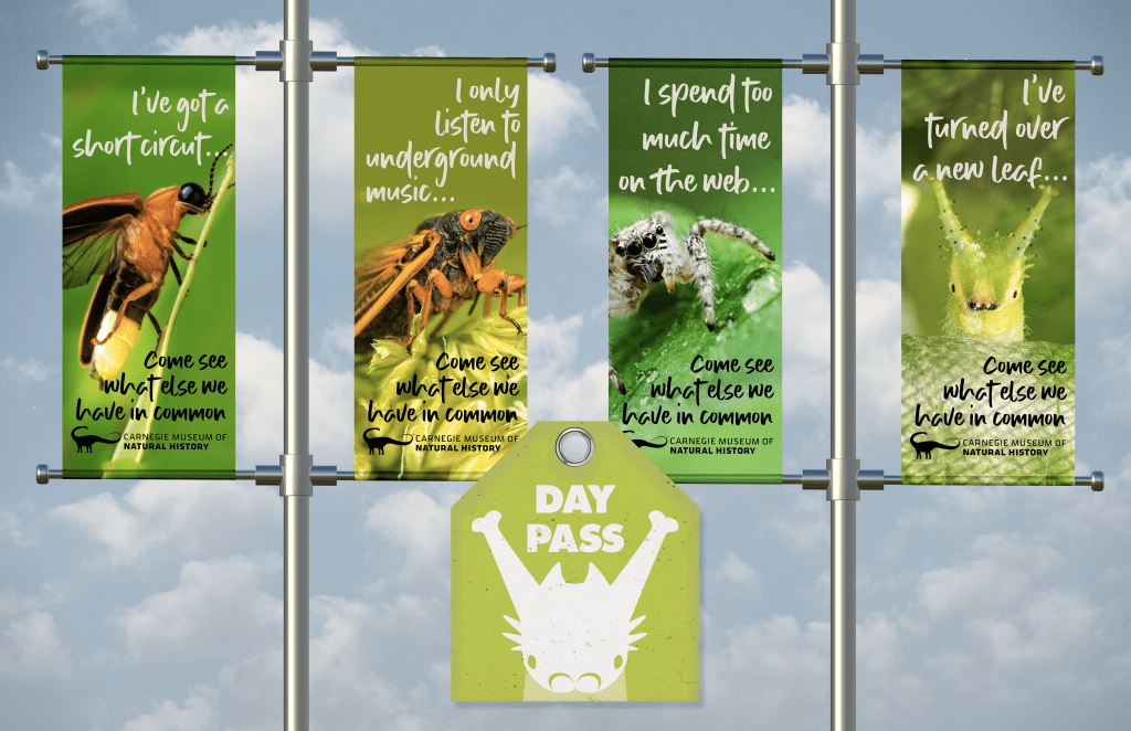 Carnegie tends to favor physical media over digital, so all designs are large scale as to print nicely. Banners and brochures would be in full color, while the Exhibit-pass would be single color on colored cardstock. Day-Passes and Exhibit-Passes are usually themed to the museum itself, however the exhibit passes are themed accordingly.